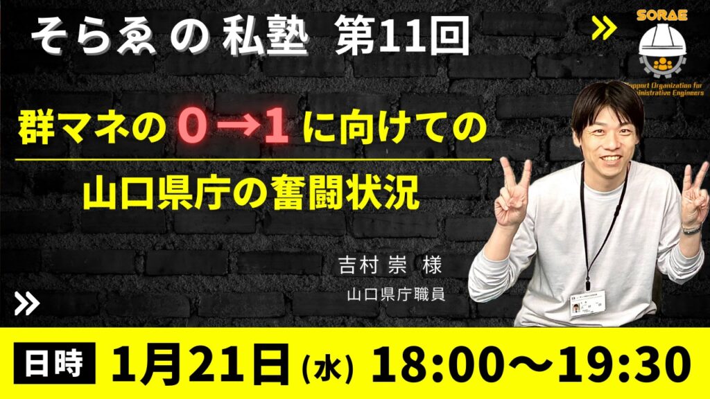 1月21日は、山口県の吉村さんが現状報告を行って頂けます。私の所属する自治体も「群マネ」について、理解が醸成されていません。まずは、自分事として将来に危機意識を持つ、そんなきっかけを提供できるようにしたいです。