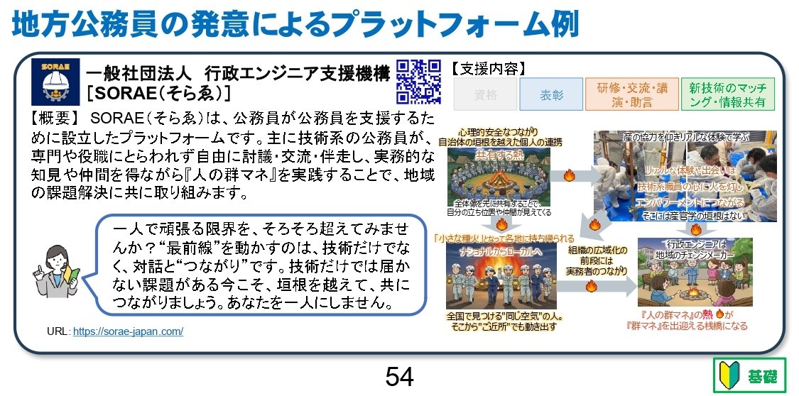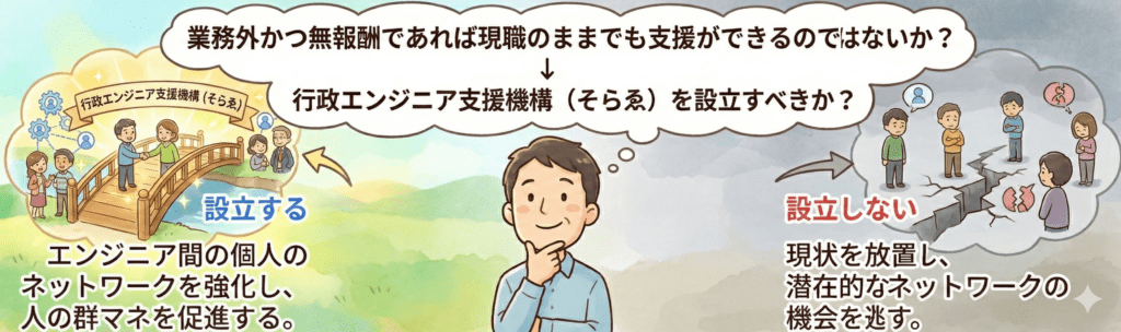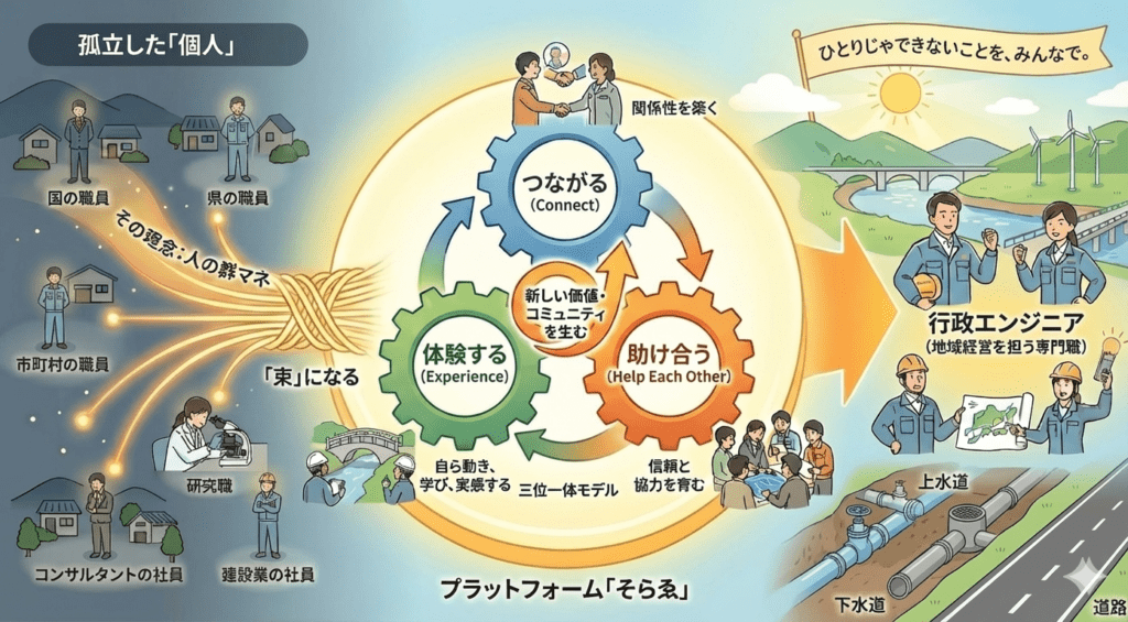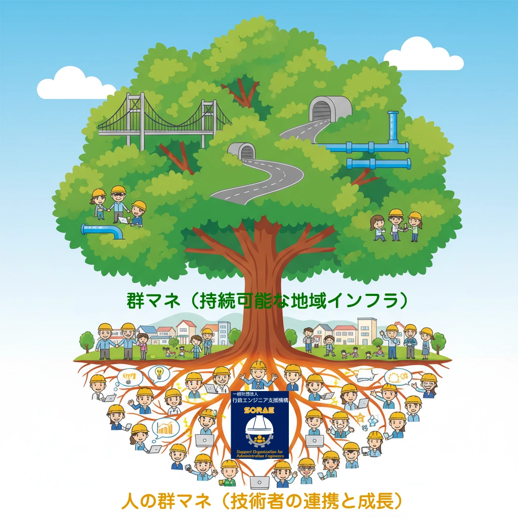 地方、特に小規模な自治体ほど技術職員は孤立しがちです。その孤立した「個人」を、全国規模でつなぎ、「束」にすることができれば、もっと多くのことができ、救える地域があるはずです。この『人の群マネ』という思想こそが、「一般社団法人 行政エンジニア支援機構(そらゑ)」を設立した原動力のひとつです。
