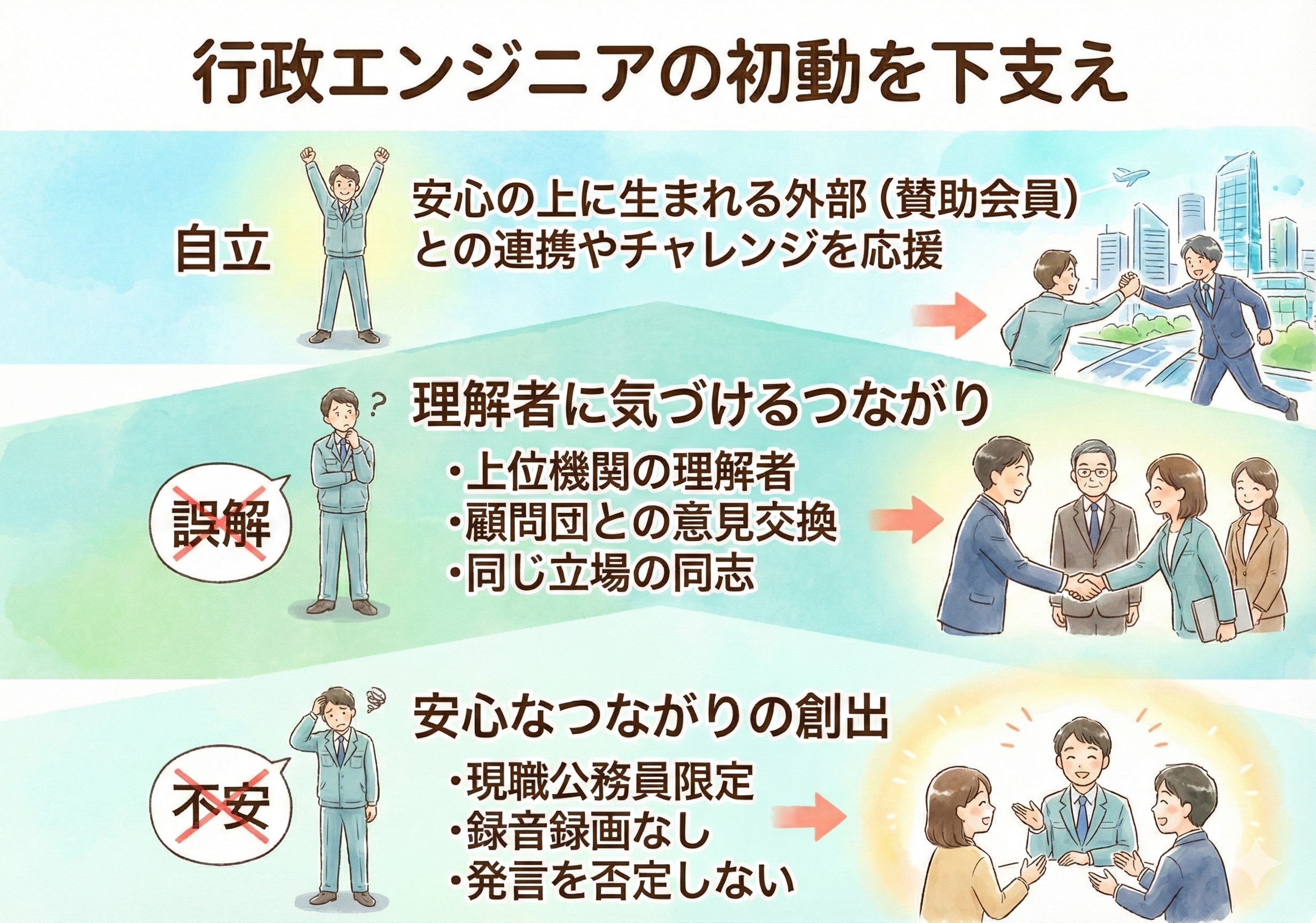 とはいえ、上記は簡単なことではありません。そもそも公務員は世の中から好かれる存在ではなく嫌われています。最前線で一生懸命に頑張っている公務員ほど、嫌われていることを認識し委縮している場合が多いです。このため、公務員が本音を吐露できる場所はメンタルを保つためにも必要だと考えました。